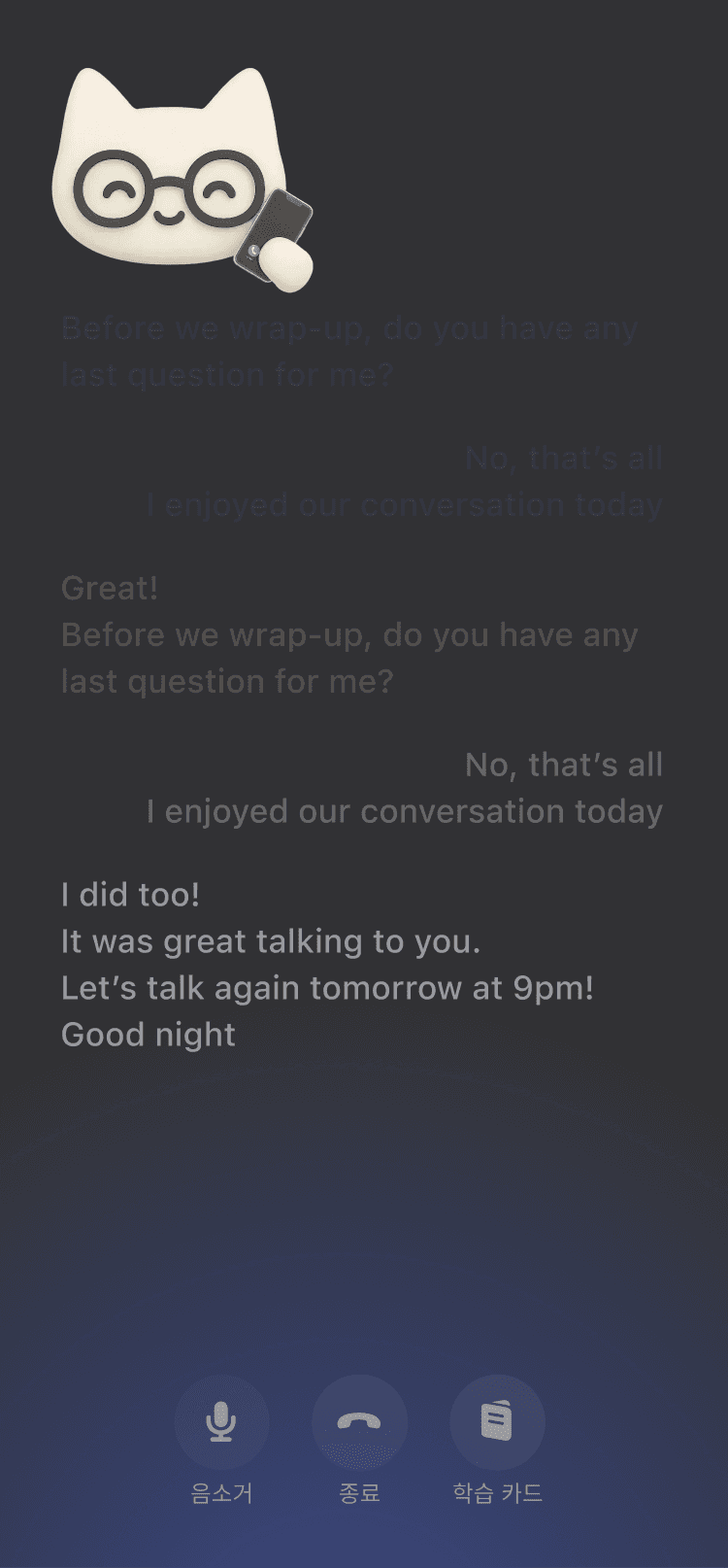 영어 말하기를 아예 못하는 수준인데 제가 정말 엉망으로 말해도 다 알아듣고 대화를 이어지게끔 해줘서 점점 자신감도 생기고 말도 많이 하게 되는 거 같아요 너무 좋아요!! 감사합니다